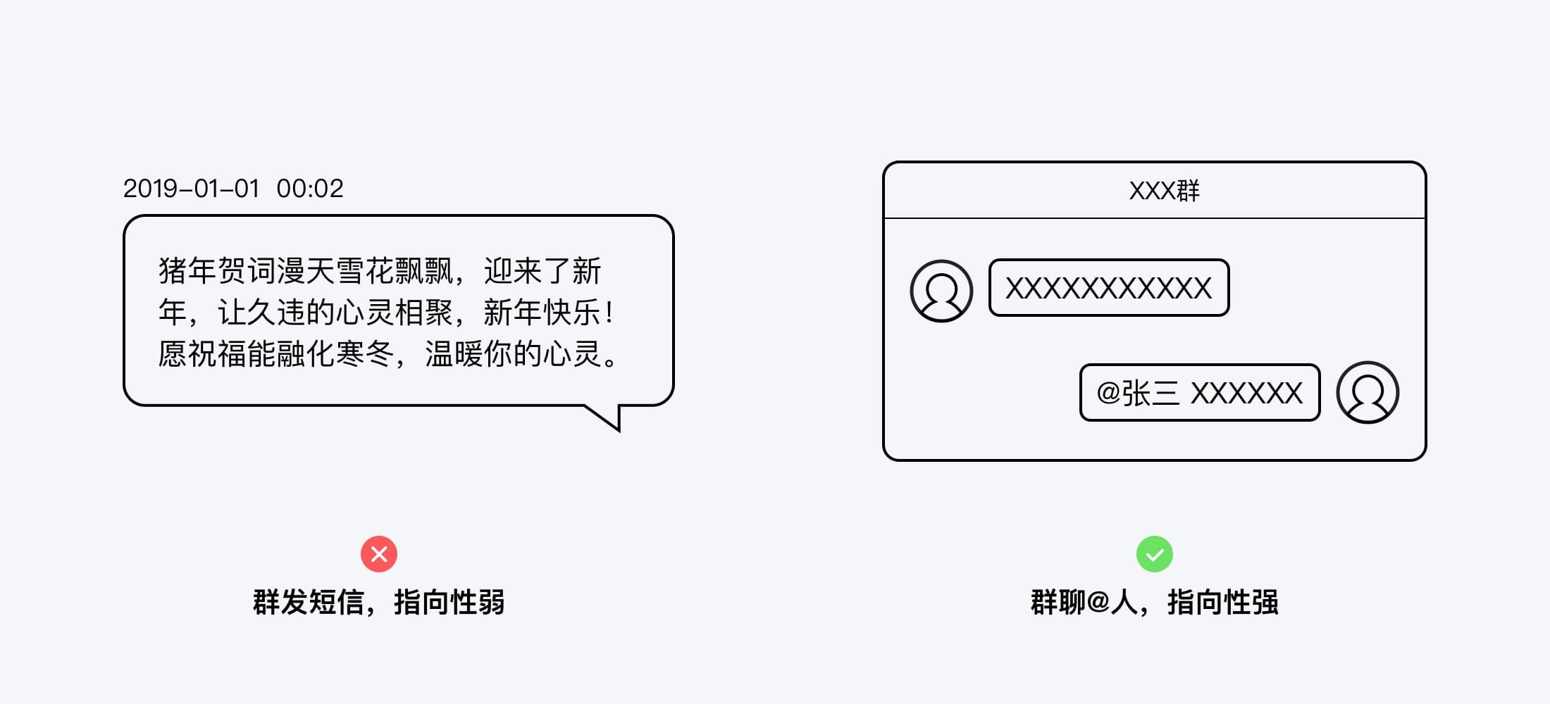 任何互动行为都是发生在两个或者多个明确的对象之间的,因此在良好的互动行为中,指向性显得尤为重要——没有人会去响应别人的自言自语。在互动的过程中,指向性不明确的互动行为是低质量的,不容易获得进一步的反馈,例如评论区中的统一回复、群发的新年问候、领导在台上的讲话等。反之指向性明确的互动是高质量的,比较容易获得反馈,例如群聊中@某个人、收件人为某个人而非邮件组的邮件、多人聊天时眼光的对视等。