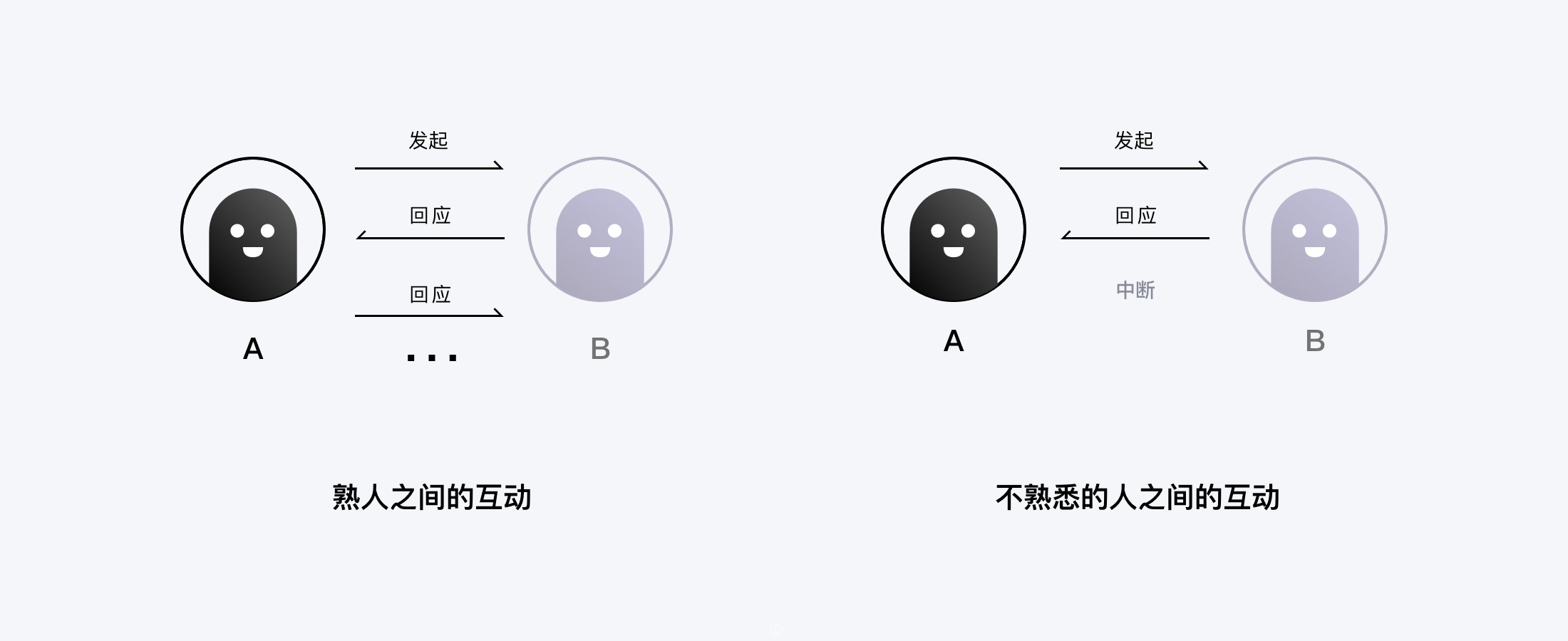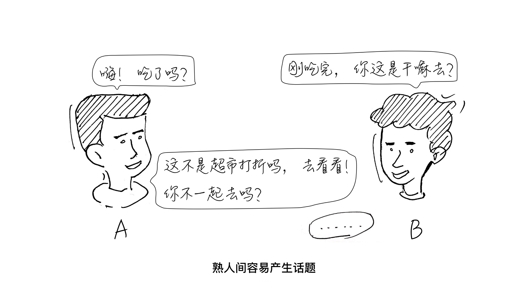 在例二中,因为A与B互相不熟悉,所以A没有对B的回复产生进一步互动,对话因此而结束。我们可以进一步推理,其实在这个案例中,不管原因变成什么,只要A没有响应B的反馈,那么A与B的互动就大概率会终止。
