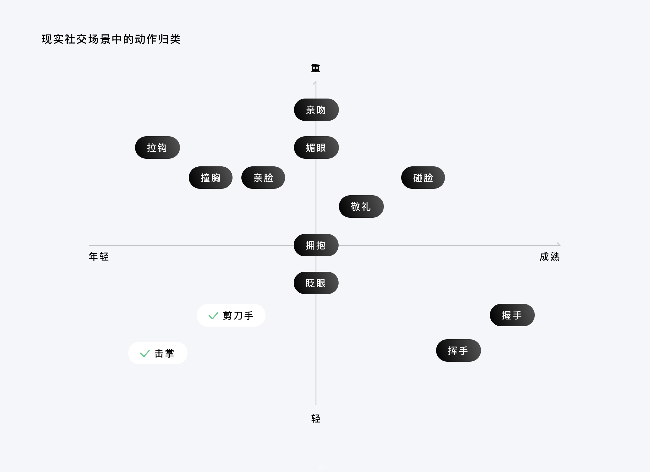 关于点赞反馈行为的语义表达,我们列举了很多来自现实社交场景中的备选方案,然后以动作的情感程度和成熟程度划分了4个象限,对这系列动作进行归类。