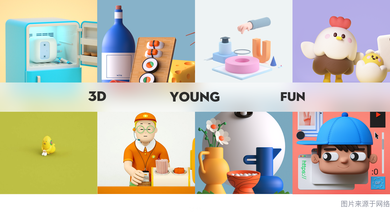 空间的主流用户以年轻人居多,为了匹配用户群体的基本调性需要打造一个“年轻”、“有趣”的3D击掌动画。为此,我们以“3D”、“young”、“fun”作为关键词收集参考素材,以此建立情绪版。