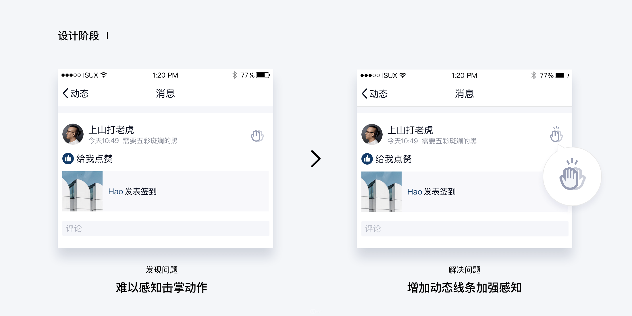 我们用两个手掌叠加的样式构造了击掌icon的基本造型。为了增强用户对于“击掌”的语义感知使用了漫画中常用的动态线条,让用户从视觉上直观感受到这是一个动态的互动行为,而非简单的单方面点亮icon,以此加强用户对击掌这个互动行为的认知。