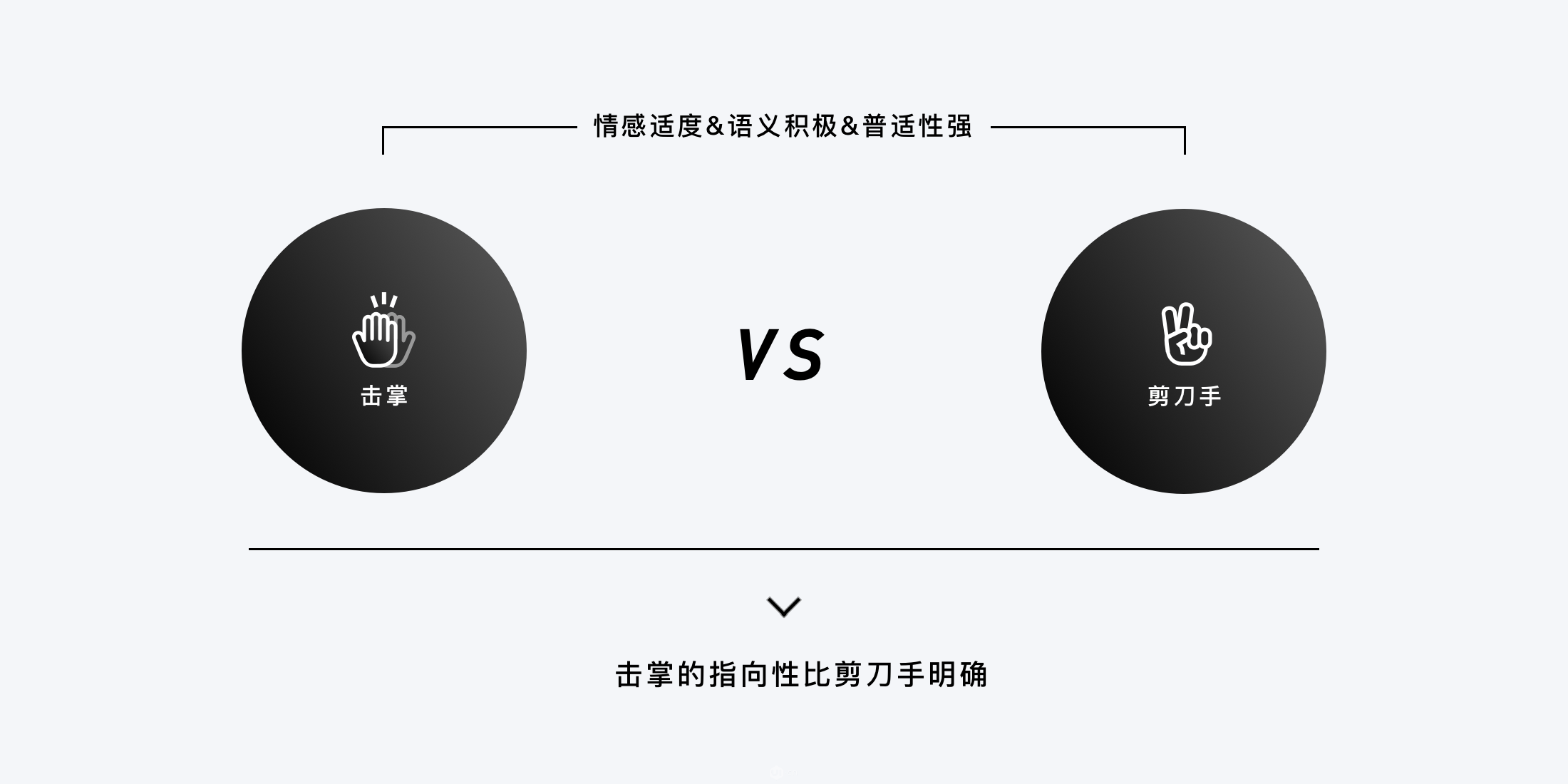 由于点赞行为本身所传达的情感是比较轻量化的,我们更倾向于选择一个轻量化的情感表达方式作为点赞的反馈;同时由于Qzone的用户群体以年轻用户为主,我们还需要选择一个尽量贴合年轻用户感官的语义。因此我们在象限图中初步选中位于左下角的“击掌”和“剪刀手”两个概念。考虑到“击掌”比“剪刀手”具有更为明显的指向性,所以确定“击掌”为最终的落地方案。