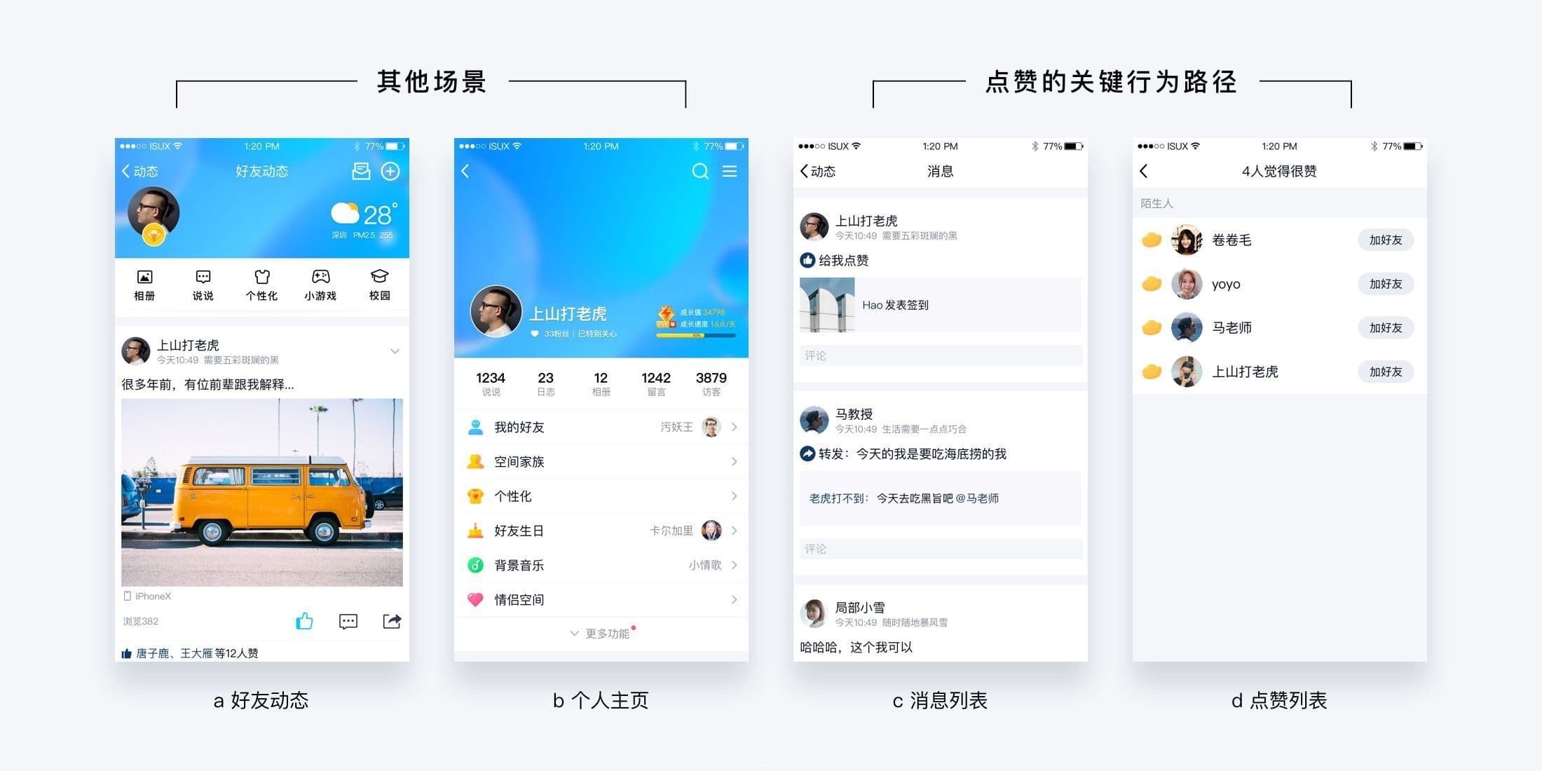 但是以上的场景中,并不是都适合承载点赞的反馈行为。根据用户的行为目的,我们可以把以上场景分为两类:围绕点赞行为的关键行为路径(图c.消息列表、图d.点赞列表)、不以点赞为核心目标的其他场景(图a.好友动态、图b.个人主页)。显然,我们应该把围绕点赞行为的关键行为路径作为主要互动场景。并且所有对于点赞的反馈都是直接依附于点赞行为本身的,使反馈行为具有明确的指向性。