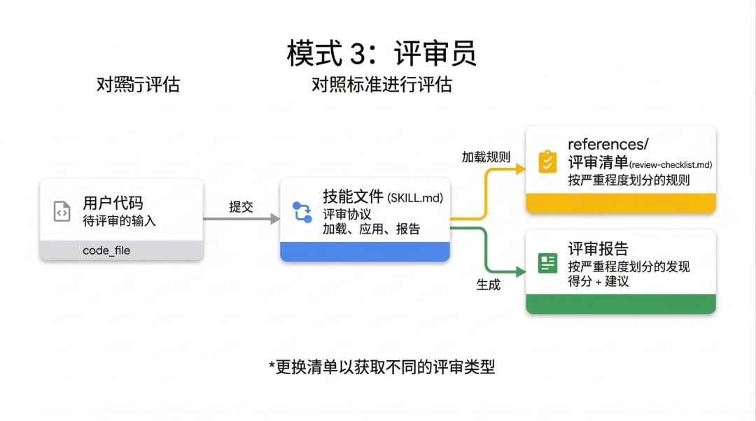 但“审查员”模式的精髓在于:Skill 只负责当“判官”执行检查,而具体的“条文”则从外部动态加载。