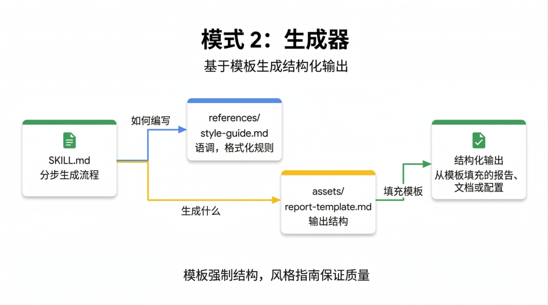 那么“生成器”这个模式的核心理念是给 AI 发一张“填空题试卷”,确保输出的高度一致性。