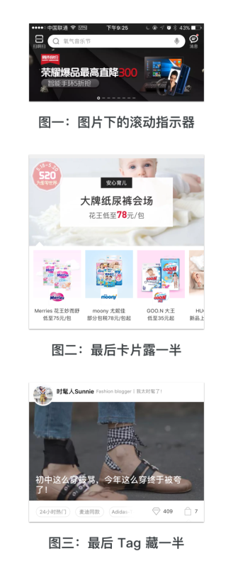 但不管怎么样,必须要有明显的标志告诉用户下面的内容是可以左右滑动的。尤其,当你的用户受众面非常广(普通电商、新闻阅读等)时,年龄较大的小白用户未必像设计师和产品经理们对“左右横滑”的交互这么熟悉,这也会间接导致这种方式的效率下降。