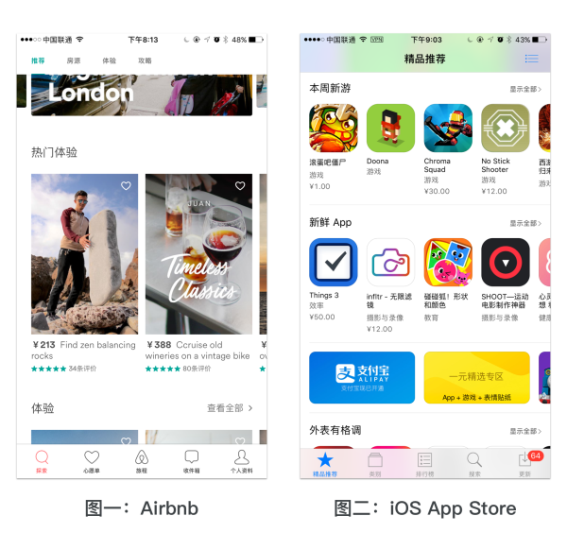 以最新版的 Airbnb 为例,它将首页分割为 Banner、热门体验、体验、房源、旅游目的地精选等多个维度,每个维度单独占据一整行,并展现并列的内容。再看 iOS App Store,也是将页面分为诸多维度,把不同的应用分类呈现。