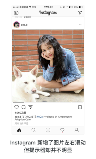 举个反面例子,Instagram 不久前新增了图片多张左右滑动的设计,但是我们发现它底部的指示器在头上图片非常抢眼的情况下非常不容易被发现,指示效果并不好。