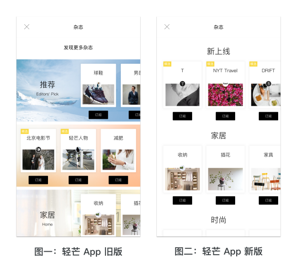 最近还常见到比较夸张的做法,是直接在泳道最左端给一个强内容氛围。以下图左侧的轻芒阅读 App 旧版页面为例,图片+文字氛围的做法虽然极大强调了主题,但却也极大浪费了展现效率,违背了内容优先的原则,效果并不好。