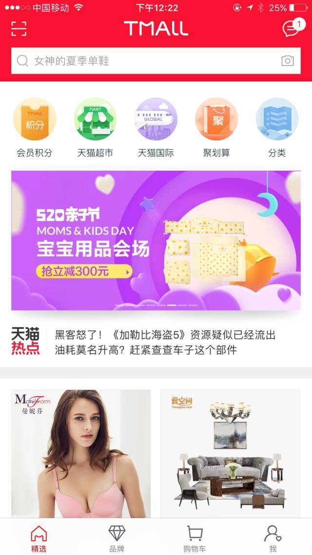 大家还记得上一版天猫的底部标签栏么?回顾一下,“天猫、关注、天猫直播、购物车、我”,新版的底部标签栏改为“天猫、品牌、购物车、我”,我勒个去,这变动也太大了吧。。。连火热的直播都给干掉了。