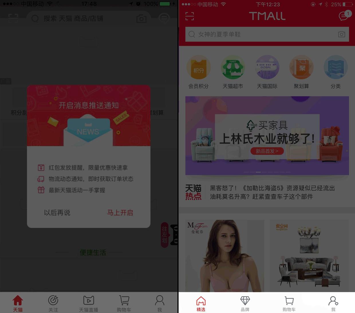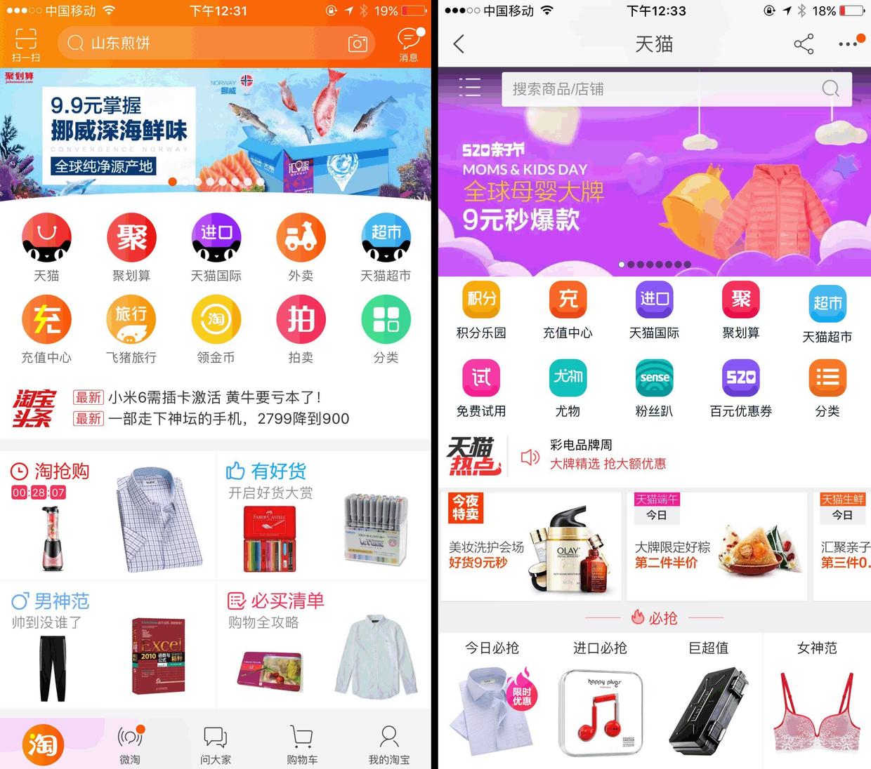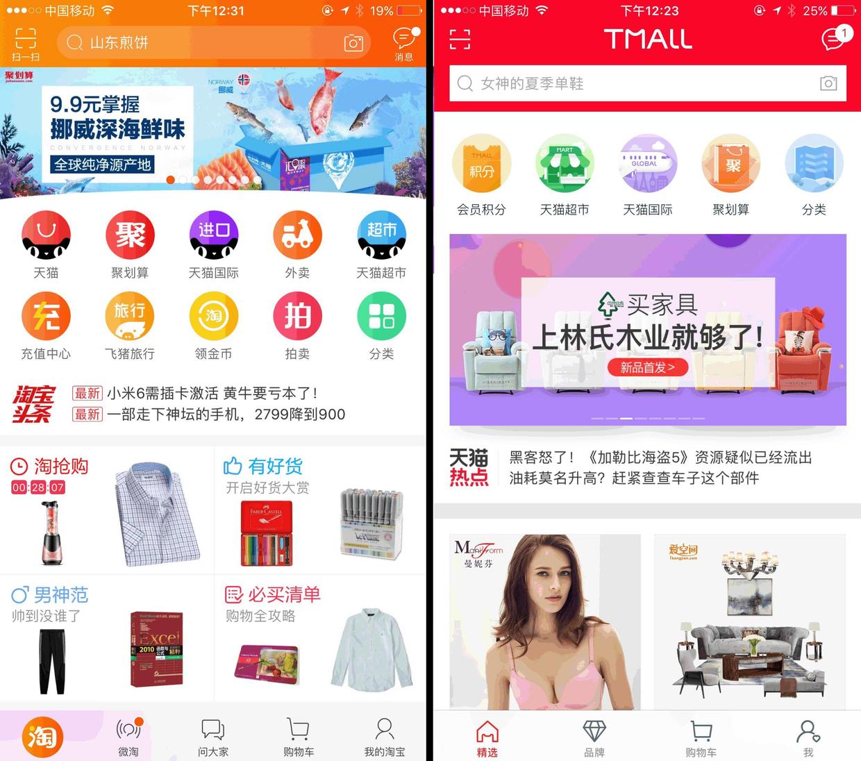 大家还记得淘宝的改版么?在淘宝之前,渐变色运用可能只是在小众的APP存在或存在一些概念设计中,而在大型的APP中,却不敢用。但是,淘宝这个巨型的APP干了这个事情,使用渐变色延续双十一的年轻态,迎合年轻人的口味。而天猫这次改版,却没有使用渐变色,反而使用了更多的卡片式设计,视觉上更加的扁平了,这是为何?为何不跟淘宝一样采用渐变色呢?更重要的是,底部标签栏居然由“5个”变成了“4个”!信息架构上做了瘦身?!这是个有意思的话题,我们下面来细聊下...